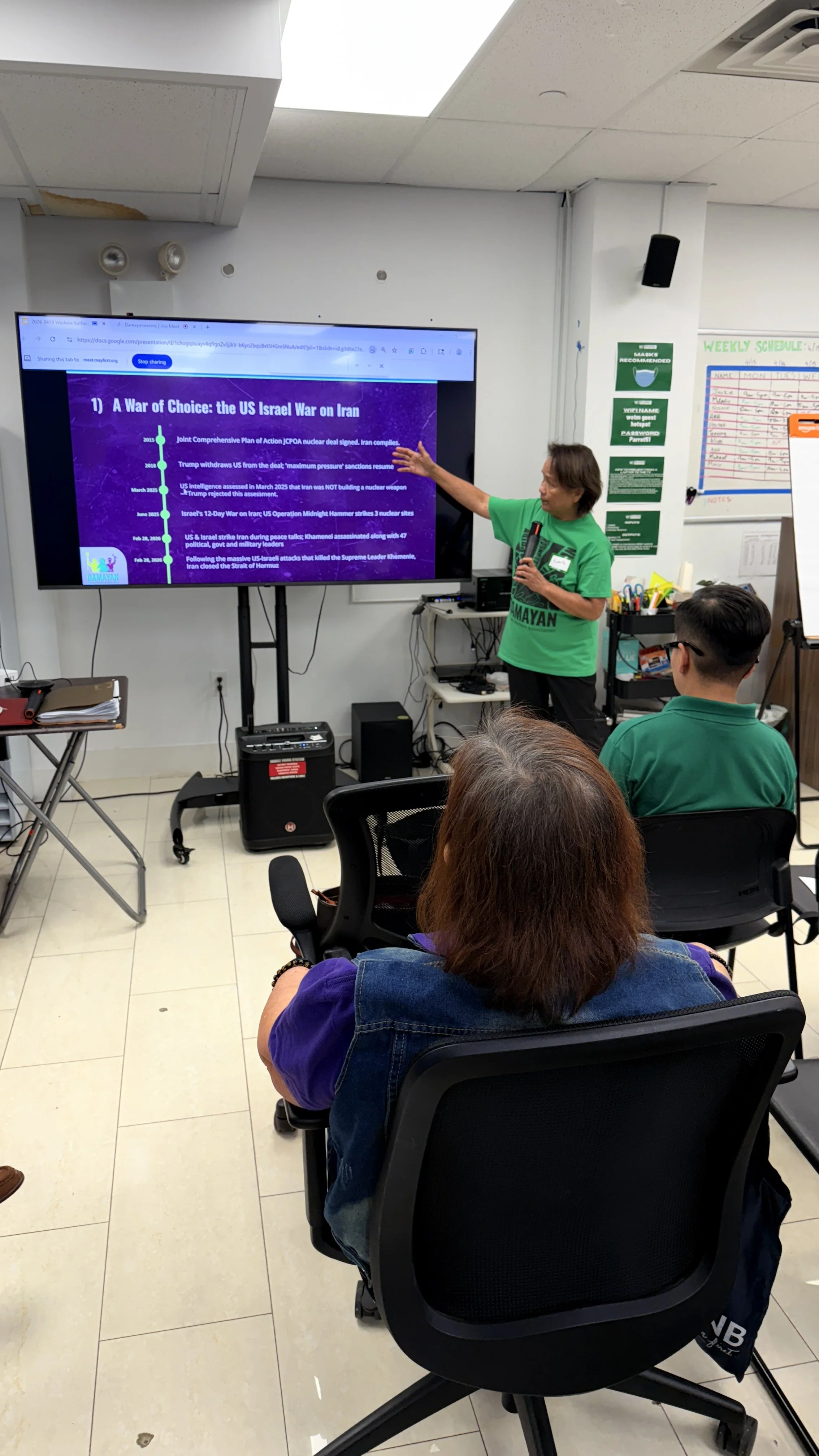 Damayan’s former executive director, Linda Oalican, discussed the War on Iran and its impact on Filipino migrant workers in the Middle East and the U.S., and how the conflict has strained families and the nation economically. Oalican urged migrant workers to support anti-war efforts for their families and homeland.